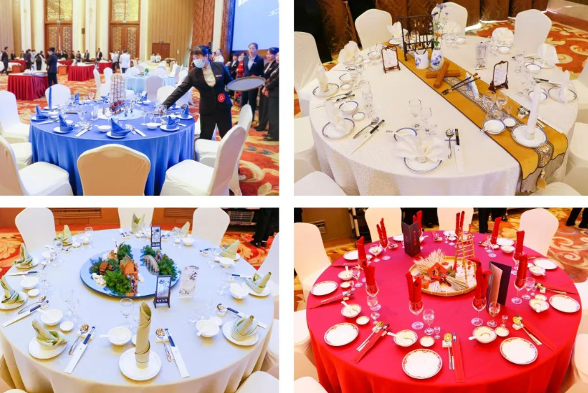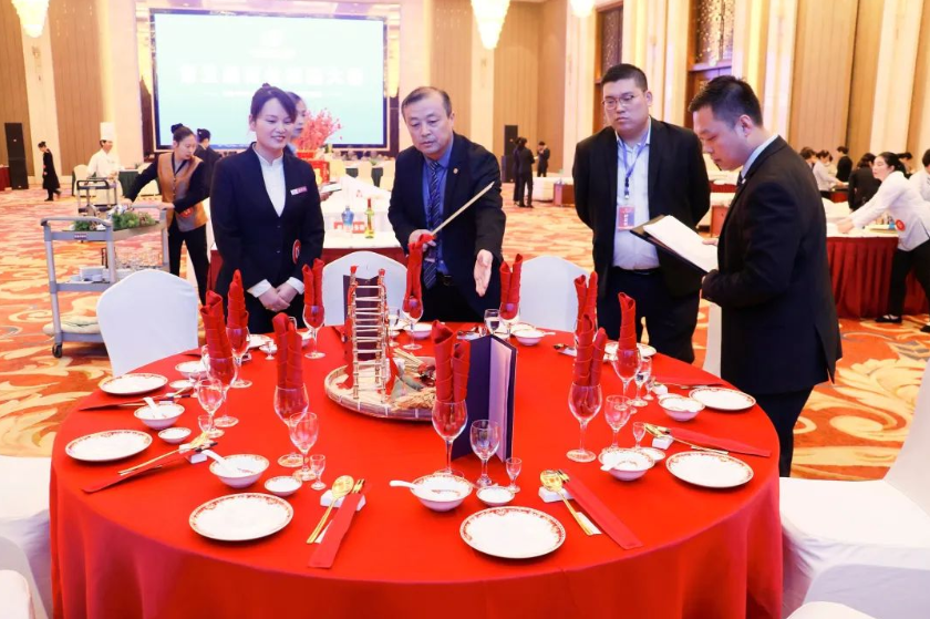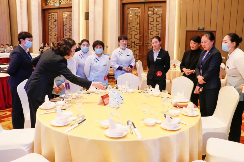 餐廳服務參賽選手面帶微笑、步履輕盈,一舉一動間迸發出規范、標準、優雅、自信,輕輕一拋、準確無誤地將臺布十字居中地鋪在餐桌上,又從主人位開始拉椅定位,麻利地將碗、碟、盤、勺、筷架、筷子、三套杯等一整套光潔的餐具依序擺開,整個桌面呈現出層次分明、中心對稱的擺臺造型;擺放好餐具后,參賽選手旋即拿起了一塊平淡無奇的餐巾,竟能折出帆船、四葉草、一帆風順等多種花型,頓時使擺放整齊美觀的餐具增添了藝術美感。