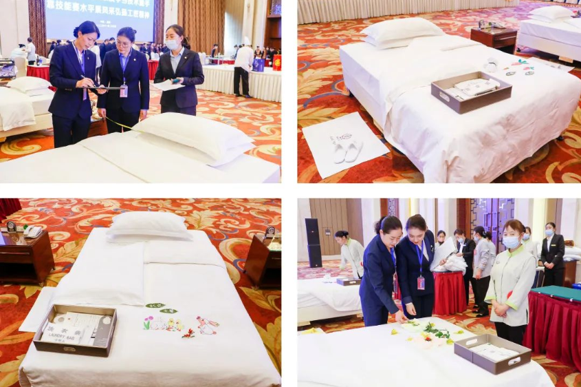 客房服務參賽選手甩單動作特別瀟灑,雙手抓住床單的兩角,只聽“嘩”的一聲,床單向床頭飛出,隨即往下一按,一手平伸一撫,一手輕抬床墊,撫床單的手再做成手刀往床底下一砍,床單的一角就坦蕩如砥地壓在床墊下,有條不紊、一氣呵成的動作頻繁劃出了一道道優美的弧線,床腳呈現出一個標準的90度,四周緊密無褶皺,3分鐘內鋪就了一張張舒適、整潔、美觀的床;創意新穎、實用性強、藝術感好的一件件夜床作品凸顯了客房服務參賽選手對賓客的感動式服務、個性化關懷,這是充分體現一個酒店細節服務的很好途徑。