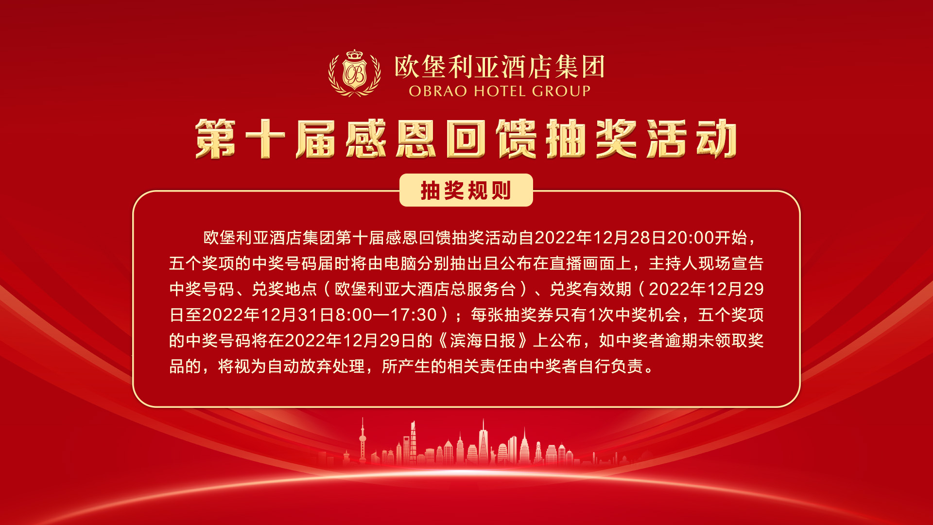 為感恩社會各界人士及廣大賓客朋友長期以來的關注與支持、信賴與同行,2022年12月28日20時,“歐堡利亞酒店集團第十屆感恩回饋活動”仍以線上直播的方式揭開了序幕,社會各界人士、歐堡利亞酒店賓客朋友12萬多人通過“歐堡利亞酒店集團微信公眾平臺”和“智慧濱海APP”,激情觀看了抽獎直播,在線見證了本屆活動五個獎項中獎號碼的現場產生,享受或分享中得“奧迪Q2L-35TFSI”轎車1輛的3年租賃權、歐堡利亞一卡通15萬元的喜悅和以20元秒殺搶到歐堡利亞一卡通現金券100元(總計6萬元)、超低價搶購歐堡利亞酒店集團旗下各酒店相關產品的刺激。