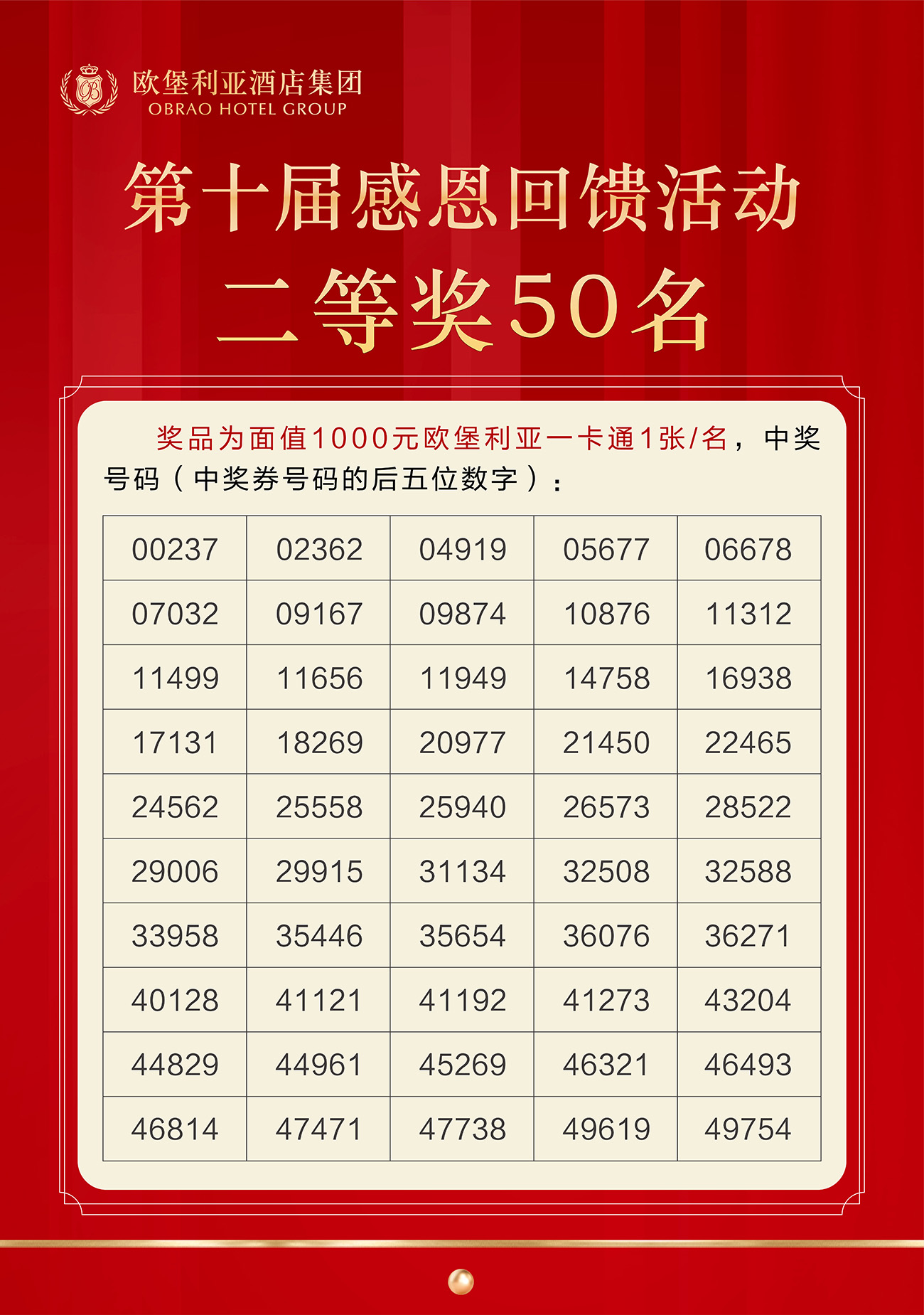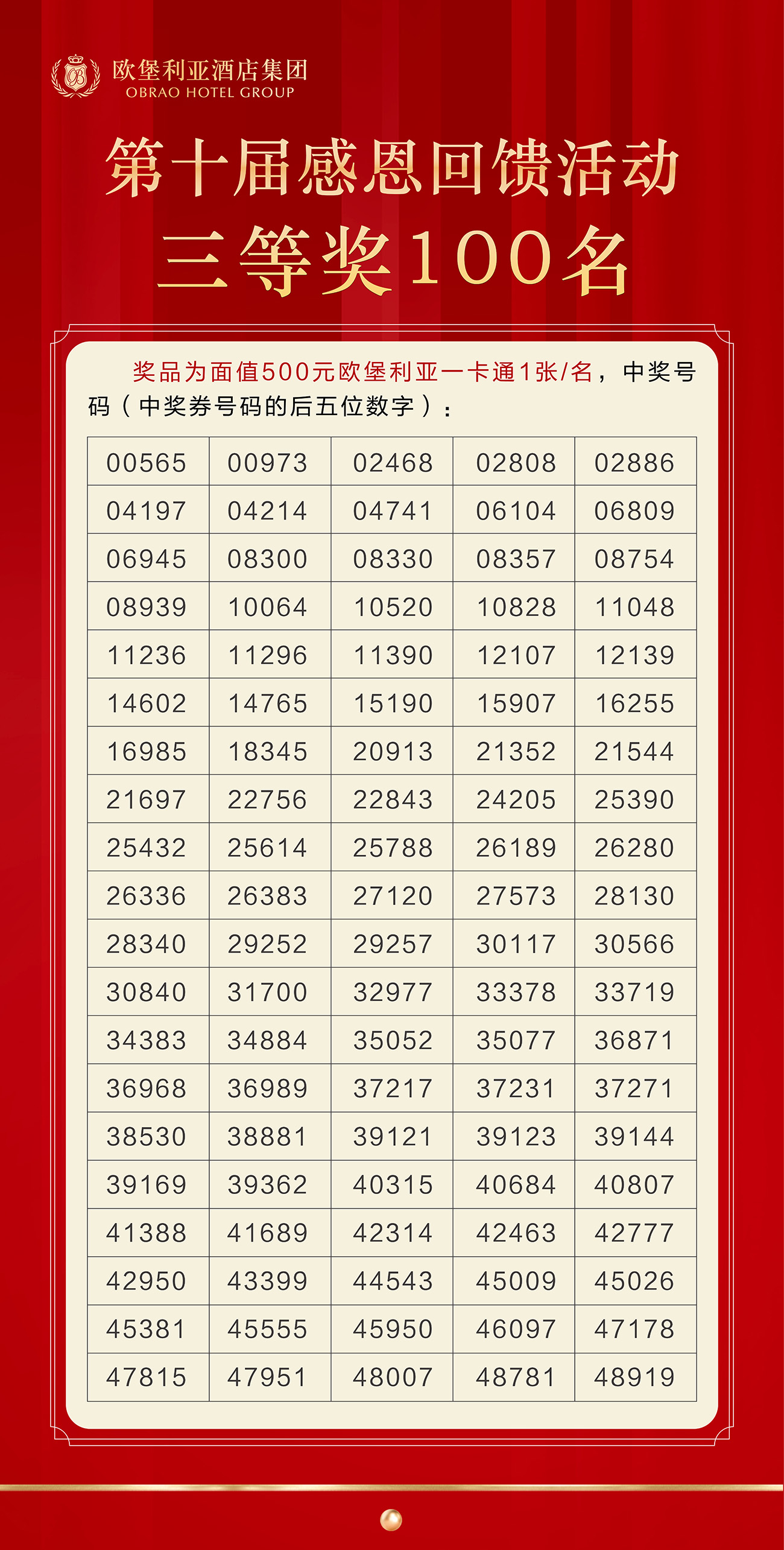2022年12月29日,歐堡利亞酒店集團第十屆感恩回饋活動五個獎項的311個中獎號碼均已刊登在《濱海日報》上。