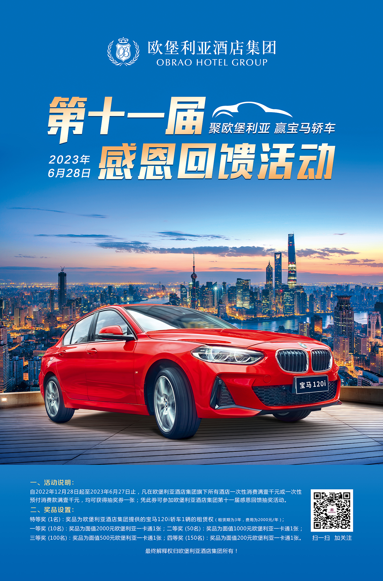 在歐堡利亞酒店集團第十屆感恩回饋活動接近尾聲時,“歐堡利亞酒店集團第十一屆感恩回饋活動”正式啟動,在2022年12月28日至2023年6月27日期間,凡在歐堡利亞酒店集團旗下的所有酒店一次消費滿1000元或一次預付消費滿1000元的客戶,均可獲贈歐堡利亞酒店集團第十一屆感恩回饋活動的抽獎券1張,讓更多的歐堡利亞酒店新老賓客朋友在切身領略到入住體驗或用餐感受后尊享額外的不虞之喜。