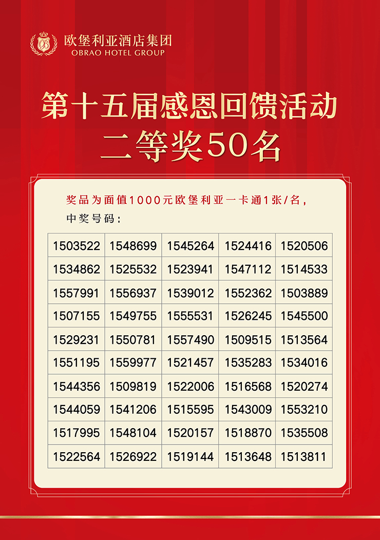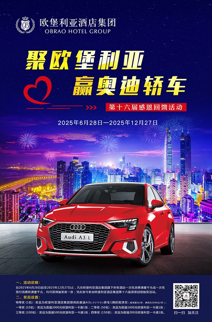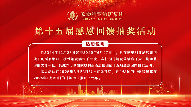 在“歐堡利亞酒店集團第十五屆感恩回饋活動”接近尾聲時,“歐堡利亞酒店集團第十六屆感恩回饋活動”正式啟動,在2025年6月28日至2025年12月27日期間,凡是在歐堡利亞酒店集團旗下各酒店一次消費滿1000元或一次預付消費滿1000元的賓客,均可獲贈“歐堡利亞酒店集團第十六屆感恩回饋活動”抽獎券1張,這不僅為這場短暫卻精彩的直播盛宴畫上了充滿期待的句點,還讓更多的歐堡利亞酒店新老賓客朋友將在切身領略到入住體驗或用餐感受后尊享額外的不虞之喜。