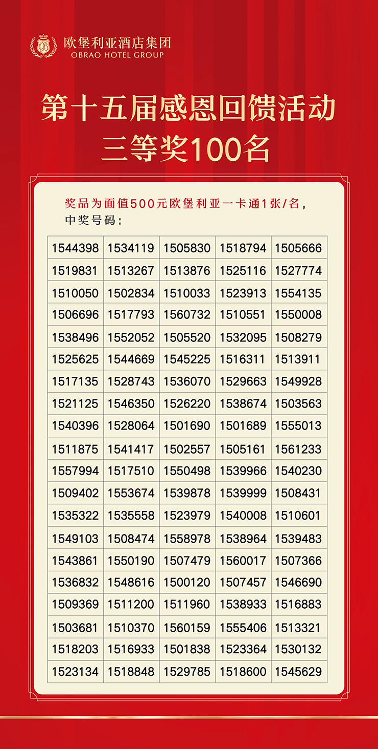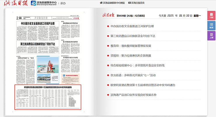 歐堡利亞酒店集團第十五屆感恩回饋活動五個獎項的311個中獎號碼均將刊登在2025年6月30日的《濱海日報》上,確保每一份幸運都有據可循。