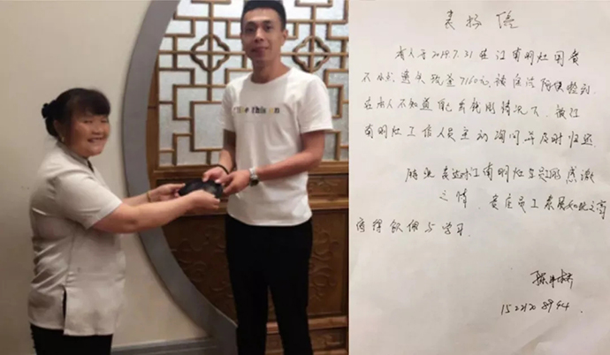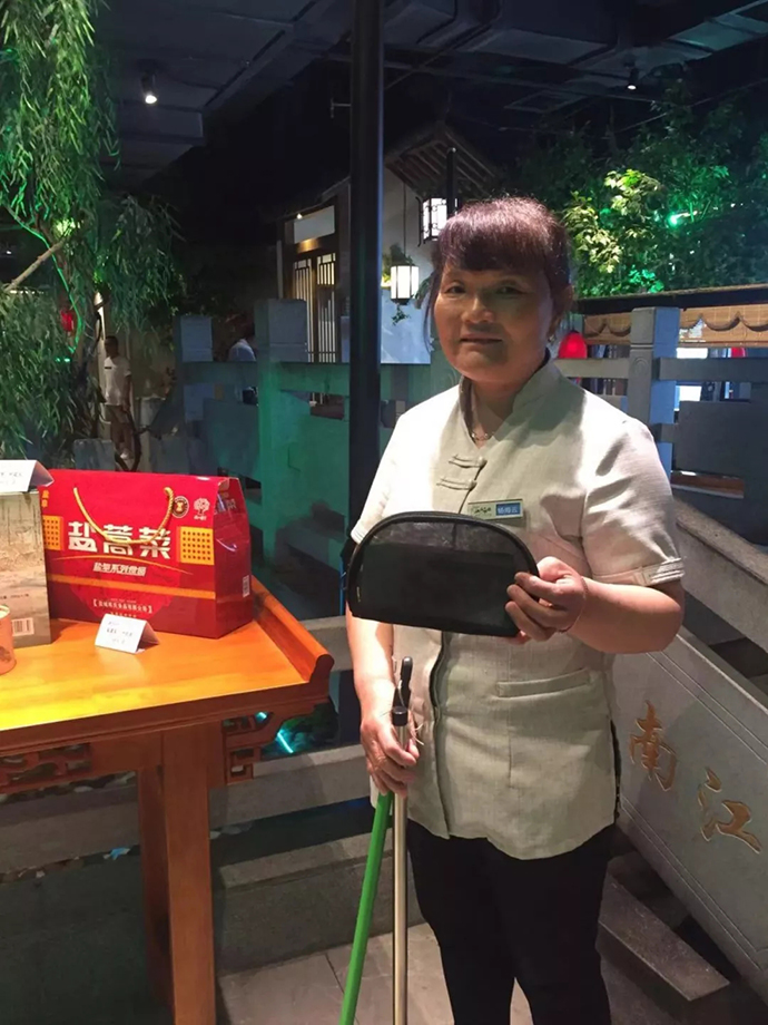 2019年7月31日中午,歐堡利亞江南明灶保潔員楊海云在打掃2樓公共區域衛生時,驀然發現賓客等位區的長椅上有一只透明、鼓鼓的黑色錢包, 看上去現金就有好幾千元。盡管她的家庭并不富裕,上有老下有小,保潔崗工資也較微薄,但面對金錢的巨大誘惑,她表現得十分坦然,第一時間內將錢包交到了收銀臺,并在2名收銀員的共同見證下,得知錢包中有7160元的現金。等候10分鐘還不見失主前來認領,收銀員便立即向酒店領導匯報,并在服務部管理人員逐一詢問現場就餐的賓客后,最終在包廂A11找到了錢包的失主。