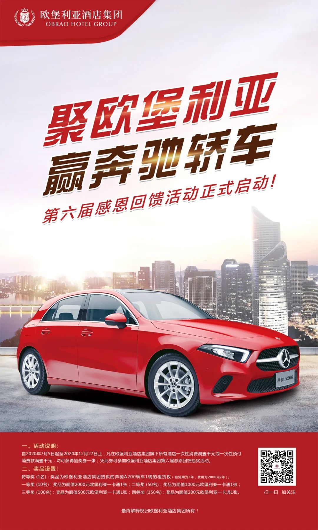 隨著歐堡利亞酒店集團第五屆感恩回饋活動的圓滿舉辦,“歐堡利亞酒店集團第六屆感恩回饋活動”正式啟動。為加大獎項設置的份量和提高中獎的覆蓋面,凡在2020年7月5日至2020年12月27日期間,在歐堡利亞酒店集團旗下的所有酒店一次消費滿1000元或一次預付消費滿1000元的客戶,均可獲贈第六屆感恩活動抽獎券1張,讓更多新老賓客朋友享受消費之外的更大驚喜。