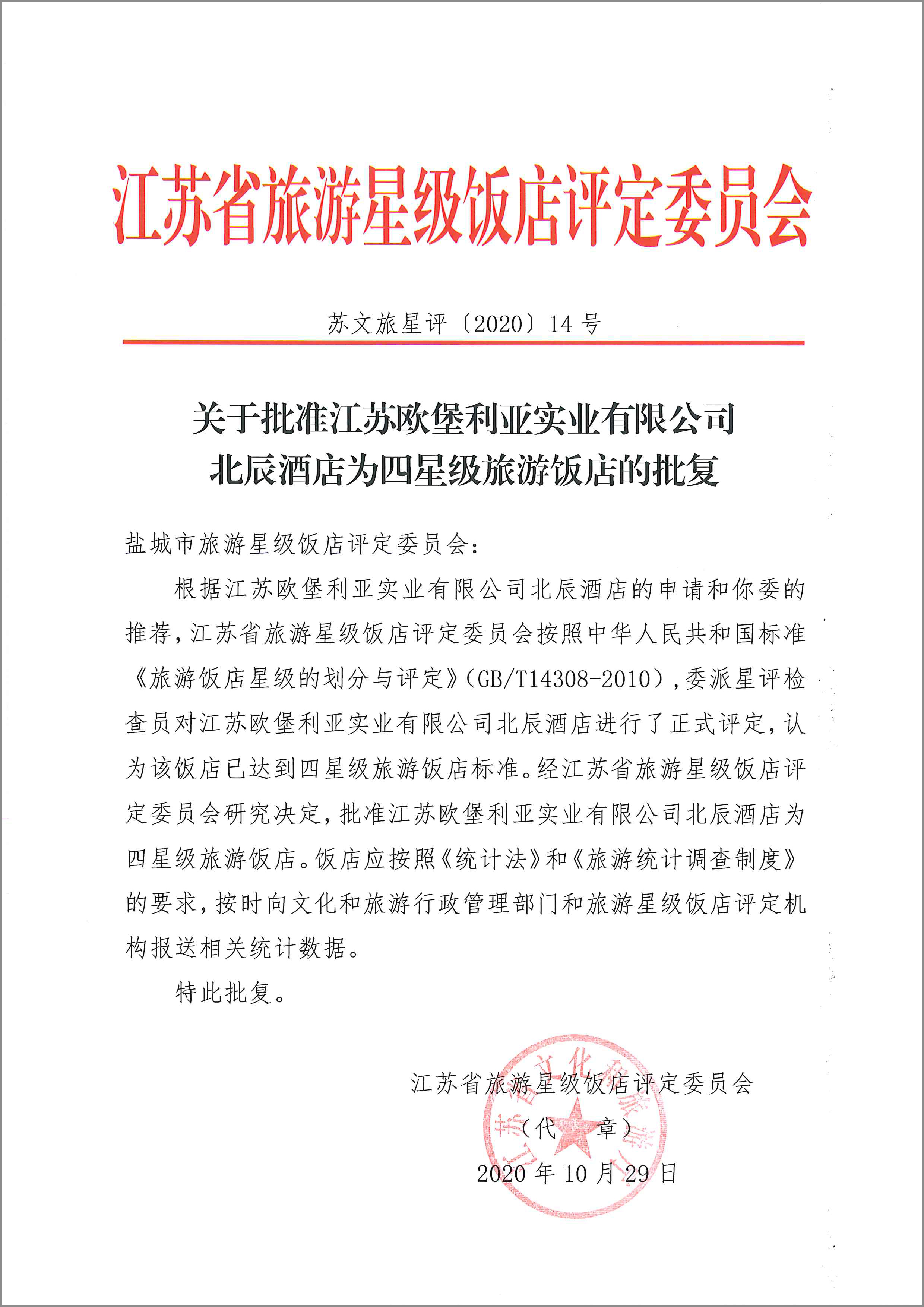 ▲江蘇省旅游星級飯店評定委員會批復