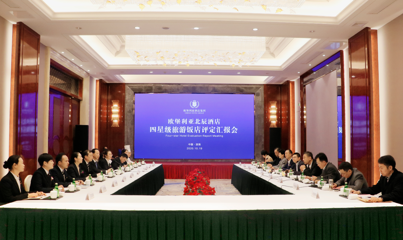 2020年10月19-20日,江蘇省旅游飯店星級評定委員會委派兩位省級星評員,對歐堡利亞北辰酒店開展為期2天的四星級旅游飯店評定性檢查和驗收工作。省市縣文旅廳局相關領導及星評員、歐堡利亞酒店集團總經理鄧棟、北辰酒店店長戴婷婷及部門經理以上的管理人員,共同參加了“歐堡利亞北辰酒店四星級旅游飯店評定工作匯報會”。