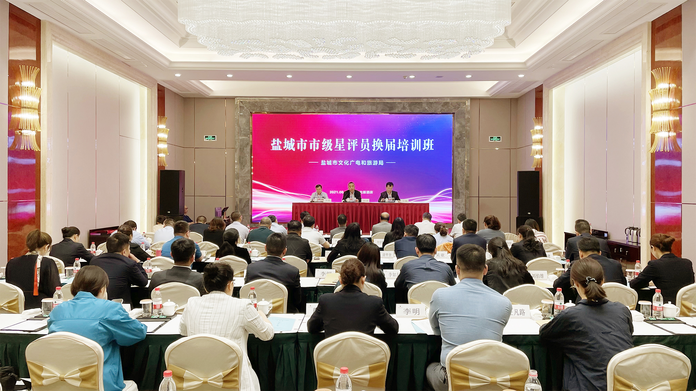 為提高市級星評員業務水平,加強旅游飯店星級評定工作,確保星級旅游飯店的質量標準,2021年6月2-3日,鹽城市旅游星級飯店星評員換屆暨培訓會在歐堡利亞北辰酒店召開,市級星評員候選人、各縣(市、區)文廣旅局分管負責人及相關科負責人共計50人參加了會議,鹽城市文廣旅局副局長唐文健到會講話,并向新一屆市級星評員頒發了聘書。
