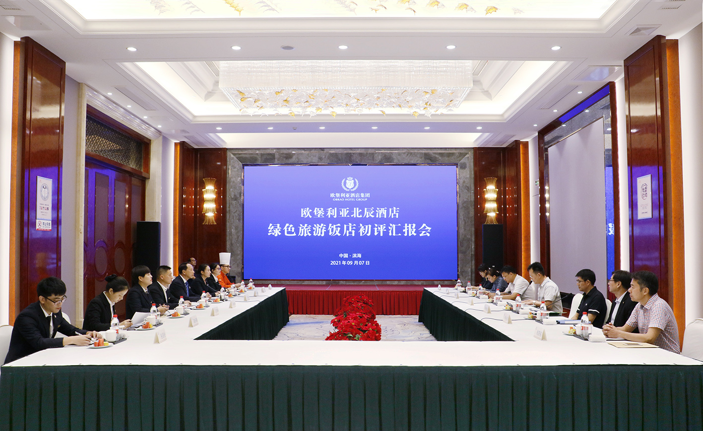 2021年9月7-8日,鹽城市星級旅游飯店評定委員會委派兩位市級星評員,對歐堡利亞北辰酒店開展為期兩天的金樹葉級綠色旅游飯店初評工作。市縣文廣旅局相關領導及兩位星評員、歐堡利亞酒店集團總經理鄧棟及副總經理胡也華、北辰酒店副店長朱麗麗及各部門負責同志,共同參加了“歐堡利亞北辰酒店金樹葉級綠色旅游飯店初評工作匯報會”。