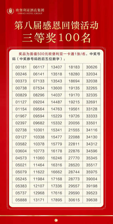 歐堡利亞酒店集團(tuán)第八屆感恩回饋活動(dòng)五個(gè)獎(jiǎng)項(xiàng)的中獎(jiǎng)號(hào)碼已在2021年11月19日《濱海日?qǐng)?bào)》上公布。
