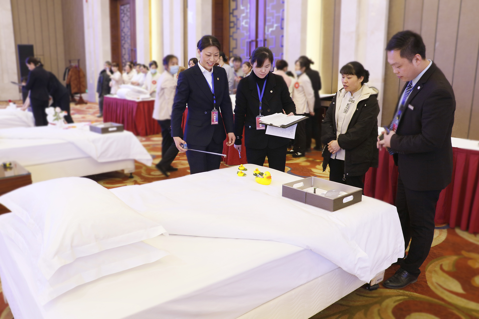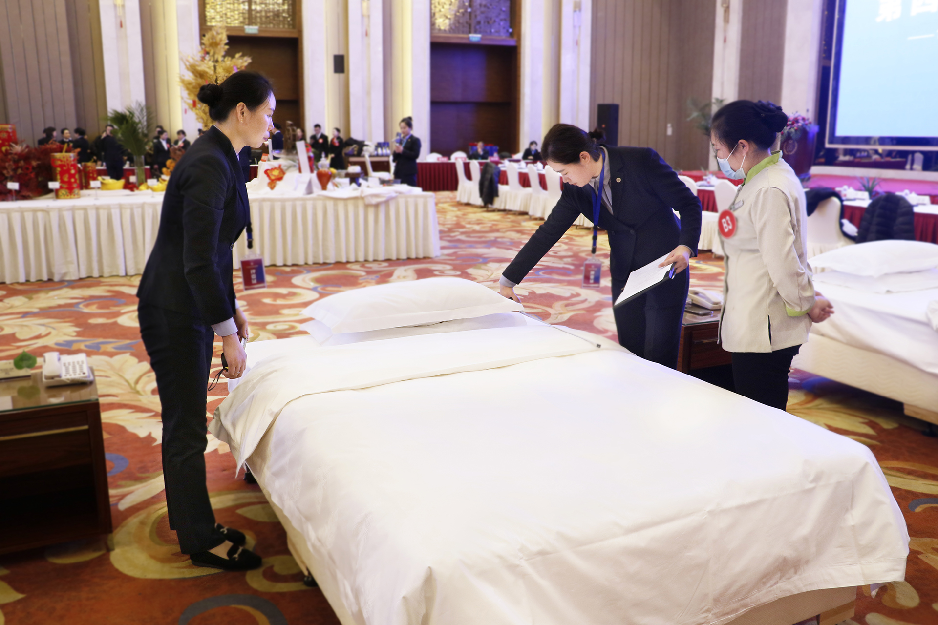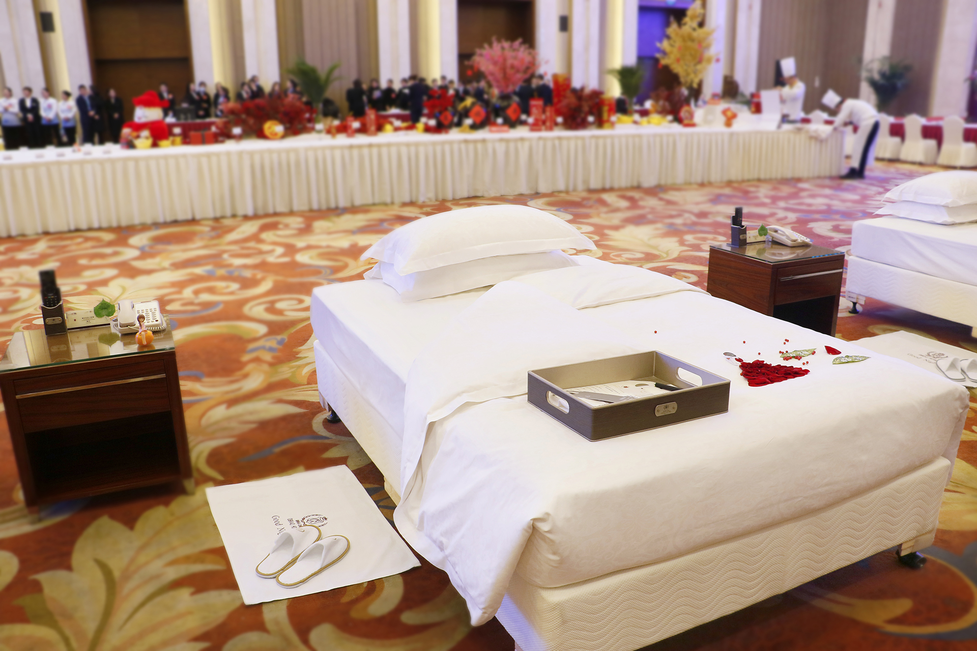 客房服務的參賽選手雙手抓住床單的兩角,床單向床頭飛出,隨即往下一按,一手平伸一撫,一手輕抬床墊,撫床單的手再做成手刀往床底下一砍,床單的一角就坦蕩如砥地壓在床墊下,有條不紊、一氣呵成的動作頻繁劃出了一道道優美的弧線,床腳呈現出一個標準的90度,四周緊密無褶皺,一張舒適、整潔、美觀的床就在3分鐘內鋪就完畢;創意新穎、實用性強、藝術感好的一件件夜床作品凸顯了客房服務參賽選手對賓客的感動式服務、個性化關懷,為大賽評委和觀摩人員呈現了一場美輪美奐的視覺盛宴。