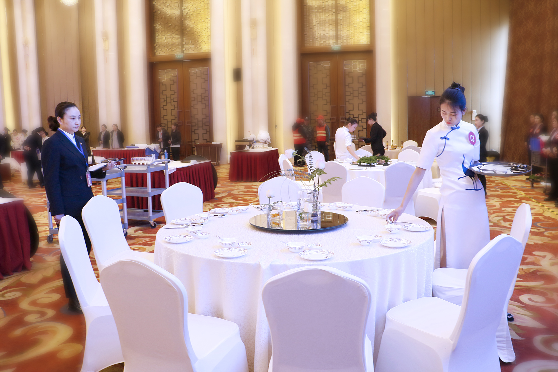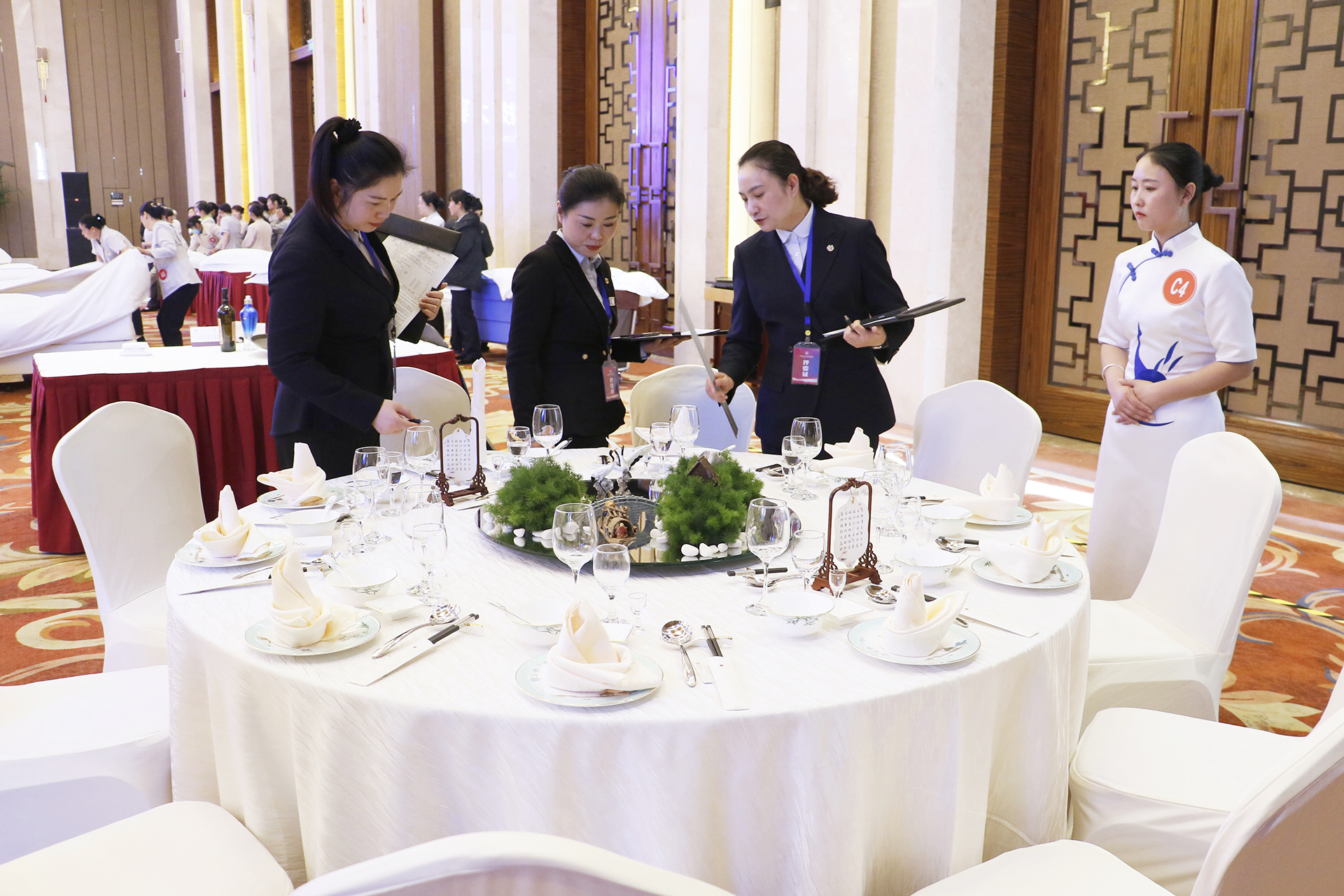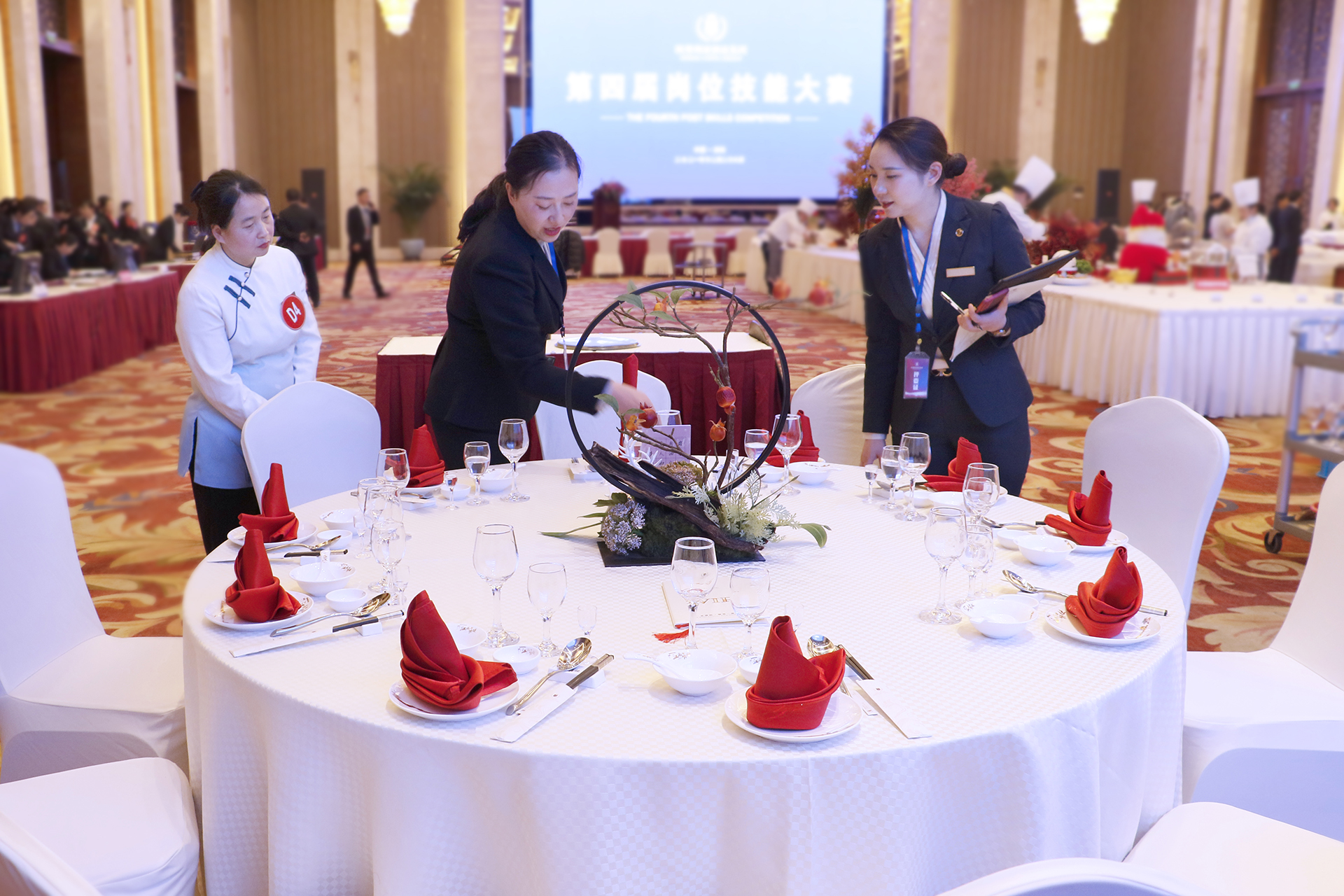 餐廳服務的參賽選手面帶微笑、步履輕盈,輕輕一拋、準確無誤地將臺布鋪在餐桌上,又從主人位開始拉椅定位,麻利地將碗、碟、盤、勺、筷架、筷子、三套杯等一整套光潔的餐具依序擺開,一塊平淡無奇的餐巾竟能被折出花開富貴、荷塘月色、喜結良緣等多種花,原本空無一物的圓餐桌經過參賽選手的創意裝飾頓時充滿了藝術美感,一舉一動間迸發出規范、標準、優雅、自信,這便是對餐廳服務技能最好的詮釋。